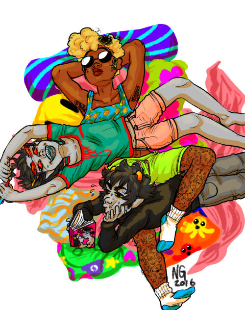 ==> Homoromantic (gay, asexual) and polyamorous==> Trans male (he/him); sometimes presents himself as traditionally feminine through appearance clothing (makeup, dresses, crop tops, skirts, etc) but still identifies as male with he/him pronouns==> Afro-Mexican==> Twunk (yes, he does regularly work out)==> 6'6"==> Has scars on his face and body==> Ambidextrous==> Really good at math, at least in no-game AUs==> A DDR and Guitar Hero king==> Still doesn't know shit about sports==> Has literally anything and everything you can imagine in his sylladex because he never fucking cleans it out... okay, maybe not everything, but you get the idea==> Loves paleontology, especially in the form of dead shit and fossils; often goes out on digs to unearth things; really wishes he could have become a paleontologist on old Earth==> Retains a bit of an interest in photography; typically takes pictures while he's outside and often takes pictures of his paleontology digs and fossils, though he's also very into taking selfies constantly==> Has taken up an interest in cooking==> Still makes music quite often; writes raps, beatboxes, and composes lyrics for singing==> His favorite music genres are rap, rock, and alternative rock==> Loves animals, especially dogs and cats; cats are his favorite==> Flirts with dudes that he's attracted to, although he's not very good at it==> Has a lil crush on John still 😳==> Talks in his sleep==> Has depression, anxiety, PTSD, scoliosis, and epilepsy==> Triggers include metal against metal, swords, blades, fighting, and blood
