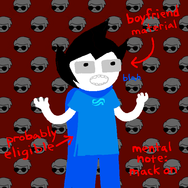 ==> Currently, there are three iterations of Dave that I have on my muse list. More may be added in the future.==> Post-SBURB Dave is my main Dave muse. There's not really too much to explain here; his timeline essentially follows the alpha/post-retcon timeline in canon and he resides on Earth C. Basically just your average, vanilla Dave. He's currently 27 years old, and sometimes I'll throw in a detail or two about him living with John depending on the specific roleplay. This Dave is not Epilogue/HS2-compliant.==> Knockoff Epilogues Dave is my secondary Dave muse, though I don't play him very often. Some concepts from the Candy Epilogues are incorporated into his lore, but he doesn't actually originate from the Candy timeline. He and John are estranged lovers who aren't over each other in the slightest, and haven't seen each other in years. Dave has also been through two divorces with Karkat and Jade, now living alone in the aftermath. There's a lot of detailed lore with this guy, so if you're curious or want to hit him up in roleplay, you can ask me for the full details.==> Davebot is my third Dave muse, and the newest addition! His timeline pretty much follows the Candy epilogue and HS2 exactly. He's currently situated on a ship with alternate Calliope and Aradia, venturing off to confront Dirk from the Meat timeline as seen in HS2. He primarily communicates with others through Pesterchum.